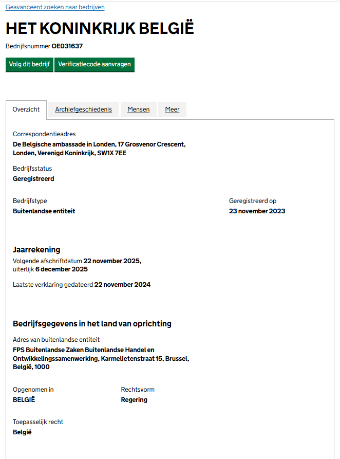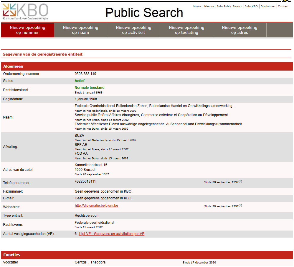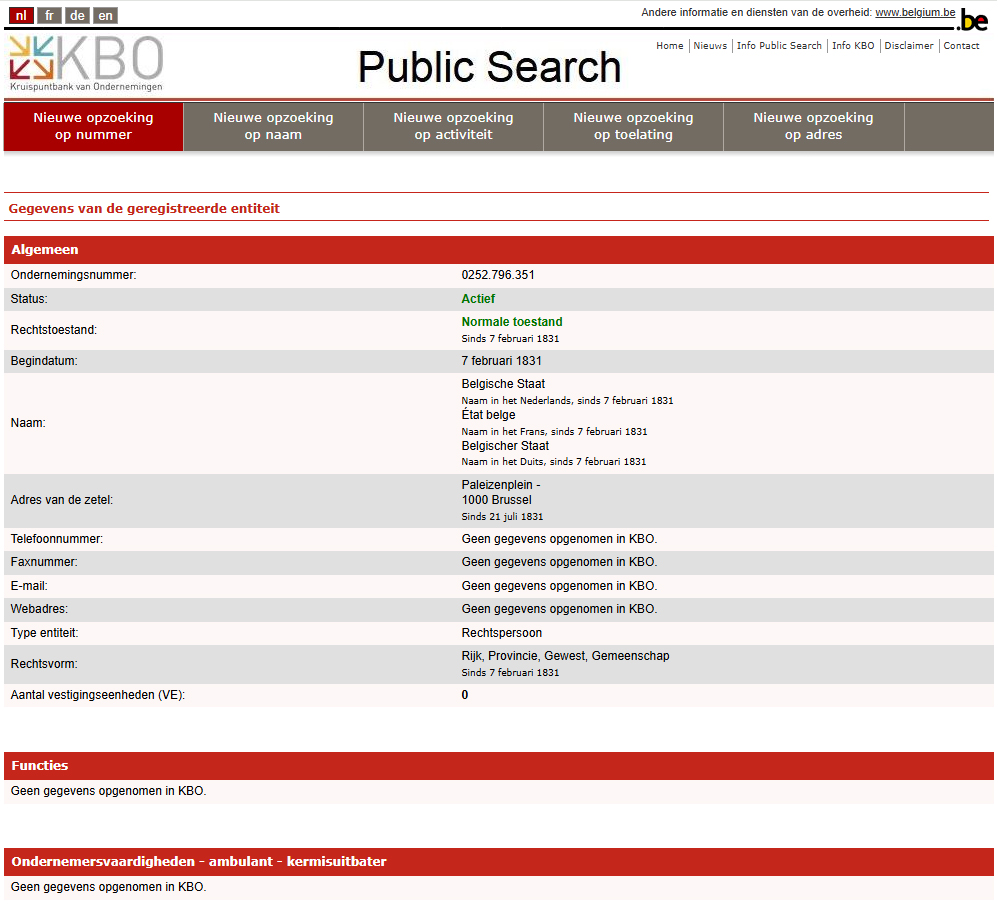 Belgische Staat heeft géén (volledig) adres namelijk er is geen huisnummer of postbus nummer heeft dus géén vestigingseenheid (VE)