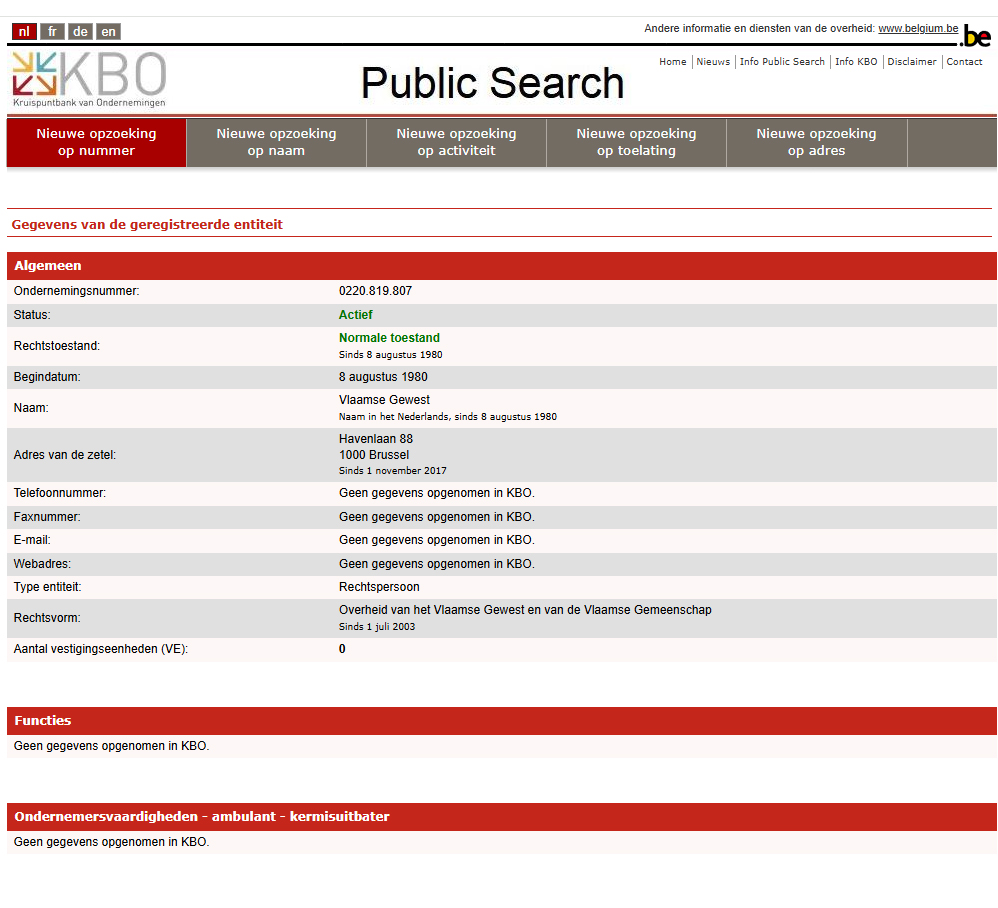 Overheid van het Vlaamse Gewest en van de Vlaamse Gemeenschap, een administratief gecreëerde juridische legale fictie entiteit Rechtspersoon met ondernemingsnummer: 0220.819.807